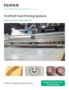 Fujifilm’s food safe fluids support baked goods and other porous food surfaces.  Both single color and full color solutions are available.  Natural spot colors are available for Caramel brown, Beet red, and others.